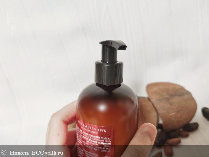 Крем для рук и тела хранится в красивом тёмно-коричневом пластиковом флаконе в объёме 300 мл.