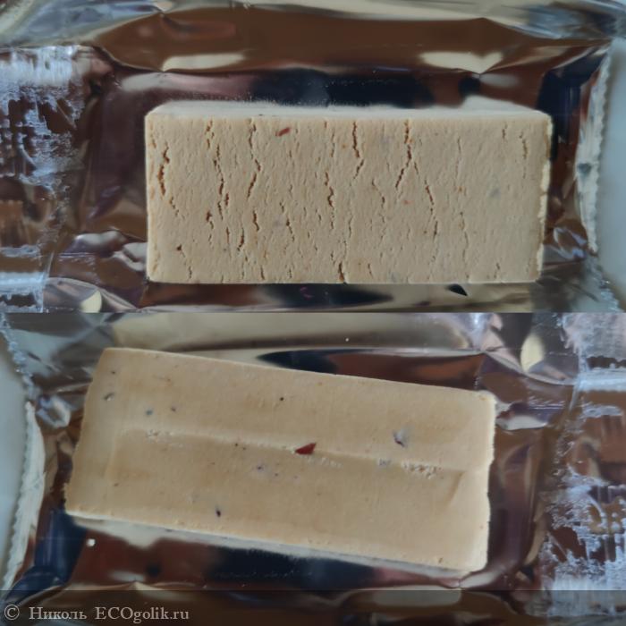 Но при этом имеется рыхлая структура. Откусывается эта сладость с лёгкостью. Во вкусе и аромате ощущается немного смородина. Её сублимированные ягодки встречаются в этом продукте.