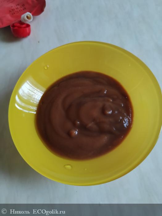 Во вкусе чувствуются сначала ноты яблока, потом нотки персика, следом клубничные и слегка малиновые ноты. Пюре имеет среднюю густоту и ягодный цвет.