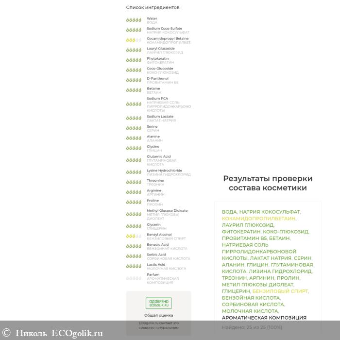 В этом чудесном составе большое количество полезных компонентов. Моё внимание привлекли эти ингредиенты: фитокератин, бетаин, глицерин, натриевая соль пирролидонкарбоновой кислоты, д-пантенол, глицин, серин, аланин, аргинин, пролин, треонин, молочная и глутаминовая кислоты, метил глюкозы диолеат, лизина гидрохлорид.
