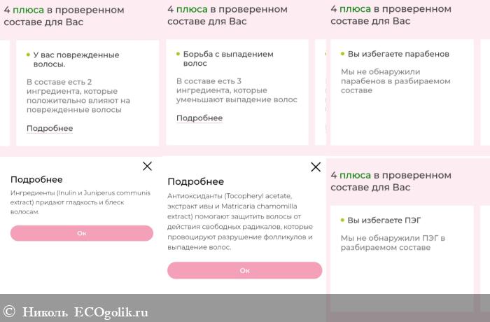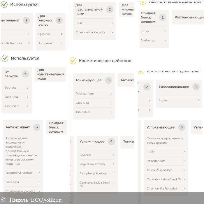 Сначала дано описание шампуня, в котором расписаны действия нескольких компонентов, входящих в его состав.