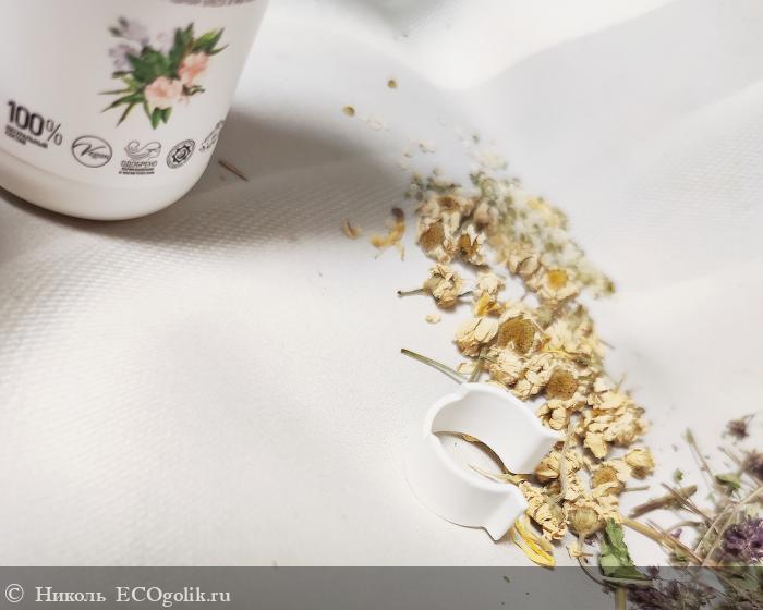 Состав богат на полезные компоненты. В нём хочется выделить такие ингредиенты, как: инулин, глицерин, пшеничный протеин, альфа-глюкан олигосахарид, эфирные масла розового дерева и герани, витамин Е, экстракты (девясила, коры дуба, можжевельника, коры ивы, душицы, рябины, ромашки), масло конопли, морская соль.