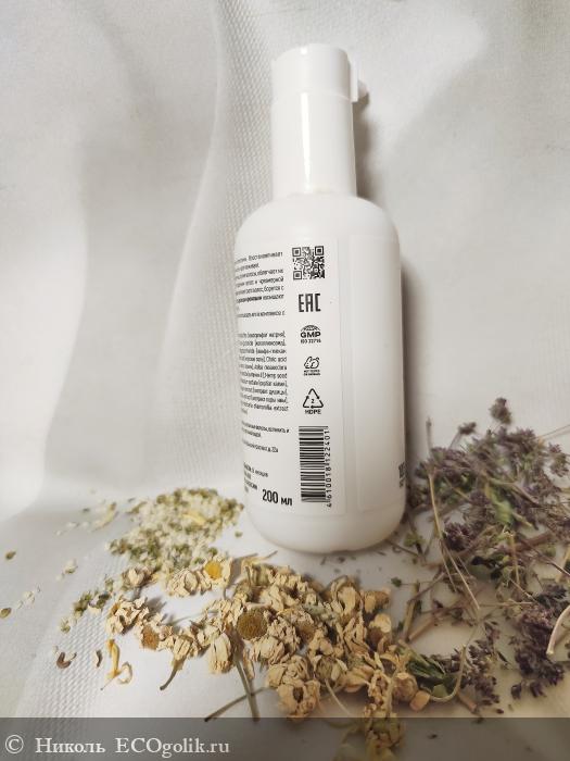Шампунь хранится в пластиковом флакончике в объёме 200 мл. На него наклеена влагоустойчивая наклейка с изображением компонентов, входящих в его состав. Рисуночек ингредиентов на этикетке подчёркивает натуральность этого уходового продукта, дизайн выполнен в стиле минимализма, оформление влагоустойчивой наклейки не создаёт нагрузку на глаза, оно спокойное, не броское.
