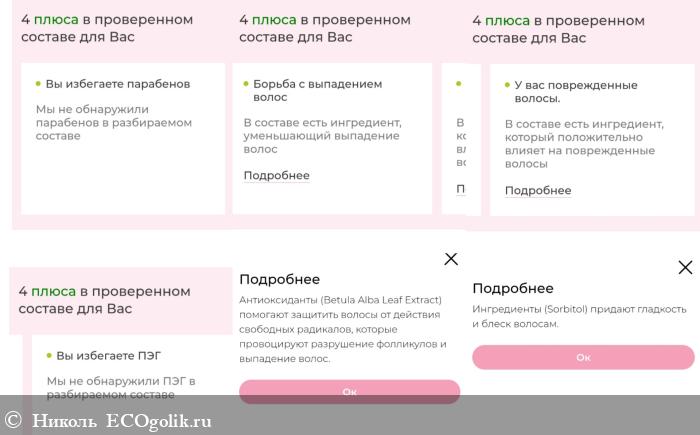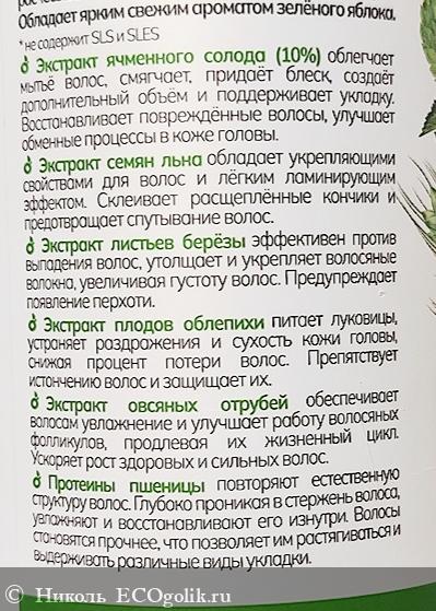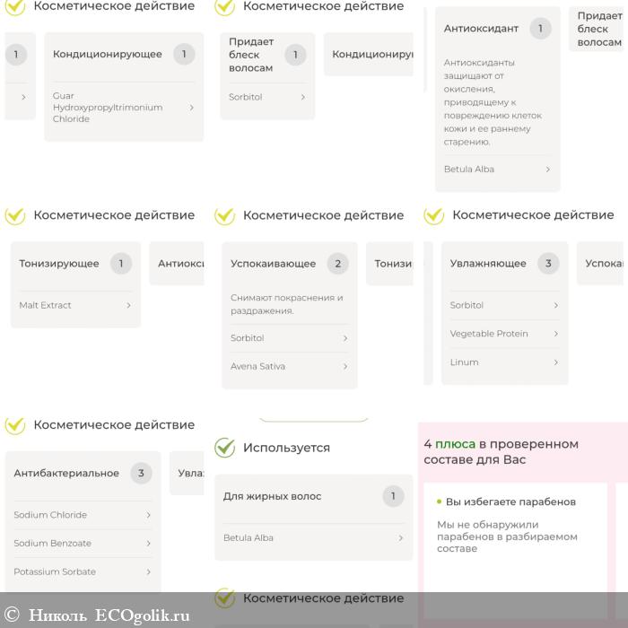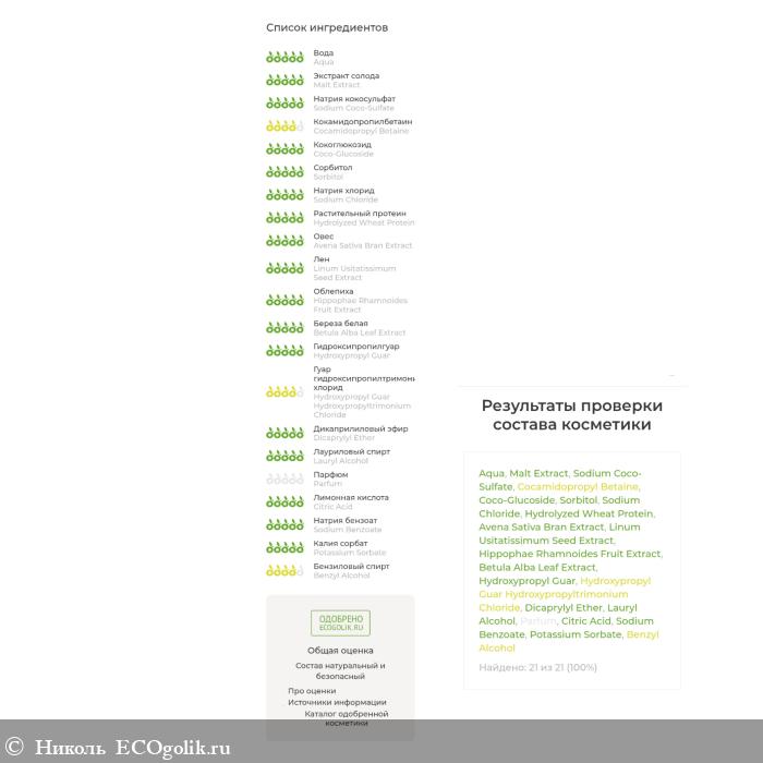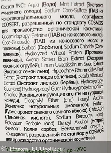 В составе, кроме ПАВ, хочется выделить следующие компоненты, такие как: экстракты (ячменного солода, семян льна, листьев берёзы, плодов облепихи, овсяных отрубей), сорбитол, гидролизованный протеин пшеницы), лимонная кислота.
