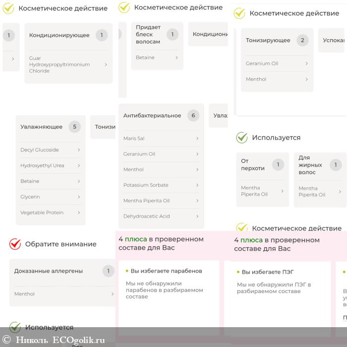 - Mentha piperita essential oil (эфирное масло мяты) придаёт аромат, обладает антибактериальным действием, является антисептиком, нормализует секрецию, кондиционирует.