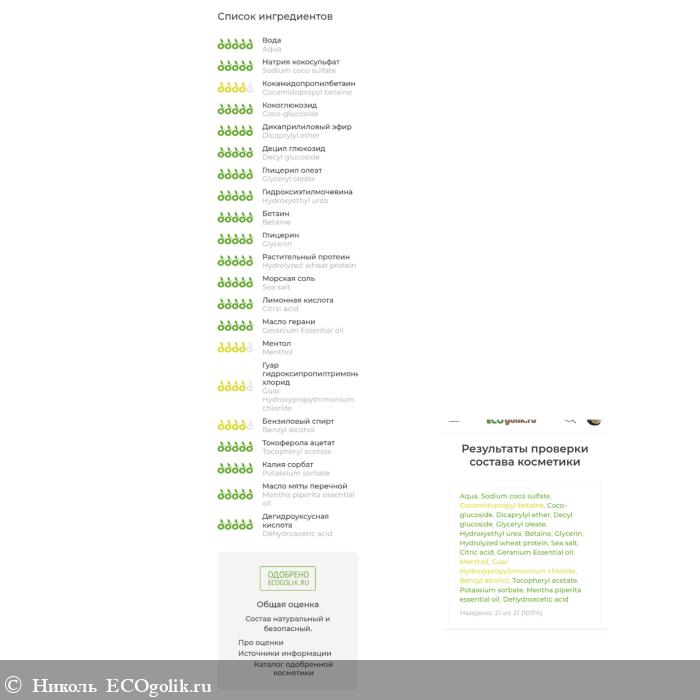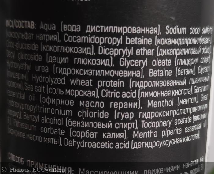 В составчике: Aqua (вода дистиллированная), Sodium coco sulfate (кокосульфат натрия), Cocamidopropyl betaine (кокамидопропилбетаин),Coco-glucoside (кокоглюкозид), Dicaprylyl ether (дикаприловый эфир), Decyl glucoside (децил глюкозид), Glyceryl oleate (глицерил олеат),Hydroxyethyl urea (гидроксиэтилмочевина), Betaine (бетаин), Glycerin(глицерин), Hydrolyzed wheat protein (гидролизованный пшеничный протеин), Sea salt (соль морская), Citric acid (лимонная кислота), Geranium Essential oil (эфирное масло герани), Menthol (ментол), Guar Hydroxypropyltrimonium chloride (гуар гидроксипропилтримониум хлорид), Benzyl alcohol (бензиловый спирт), Tocopheryl acetate (витамин Е), Potassium sorbate (сорбат калия), Mentha piperita essential oil (эфирное масло мяты) Dehydroacetic acid (дегидроуксусная кислота).