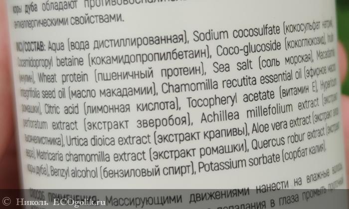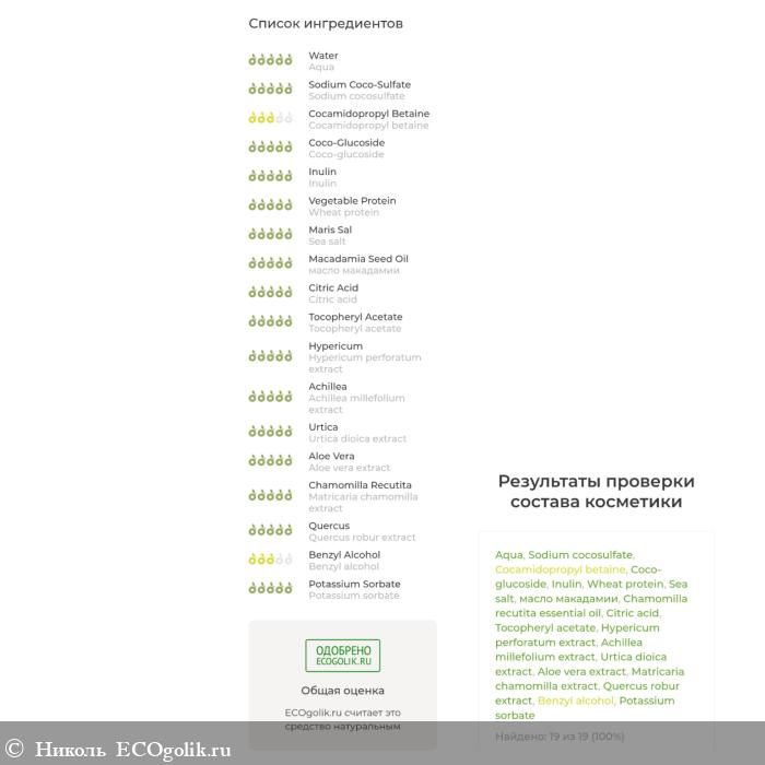 Состав шикарный, в нём хочется выделить следующие полезные компоненты: инулин, пшеничный протеин, морскую соль, масло макадамии, эфирное масло ромашки, 6 экстрактов (зверобоя, тысячелистника, крапивы, алоэ вера, ромашки, коры дуба)