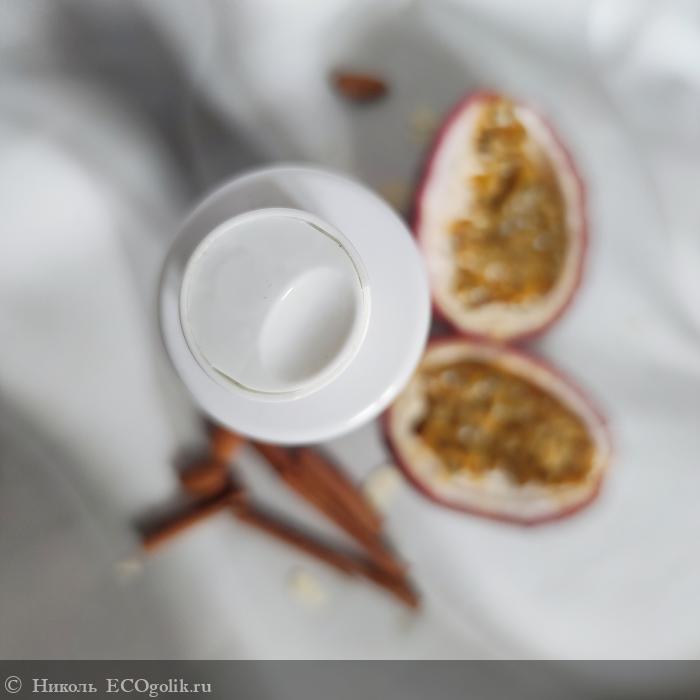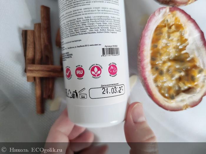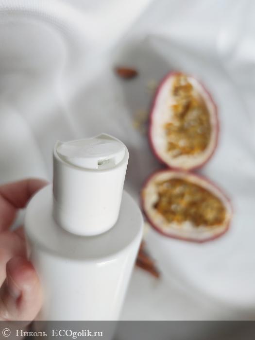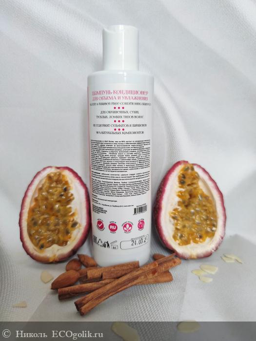 Шампунь-кондиционер имеет приятный и лёгкий аромат. Я чувствую фруктовые нотки, предполагаю за счёт экстракта маракуйи они чувствуются. И в шлейфе я ощутила цитрусовые ноты, видимо они за счёт экстракта лайма и гидролата горького апельсина.