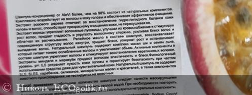Шампунь - кондиционер имеет физиологичный уровень pH 5,5. Он не содержит силиконов, минеральных масел и красителей, а также компонентов животного происхождения,