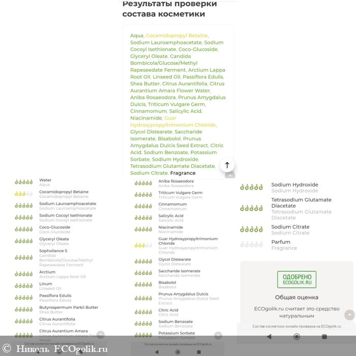 - Натрия лауроамфоацетат - кондиционер для кожи и волос, ПАВ, очищает, пеноусилитель, снижает раздражение от более агрессивных ПАВ.