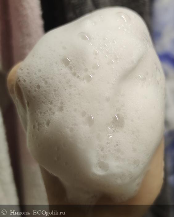 - Отлично пенится за счёт таких ПАВ: лаурилглюкозид натрия, кокоилглутамат натрия, лаурилглюкозкарбоксилат натрия и кокамфоацетат натрия. Облачко пены устойчивое, большое. И пусть консистенция хоть и жидковата у шампуня, его необходимо совсем чуть-чуть взять, чтобы образовалась так много пены, даже с первого намыливания.