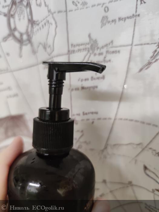 Шампунь хранится в пластиковом чёрном флаконе, на котором есть изображение волка.