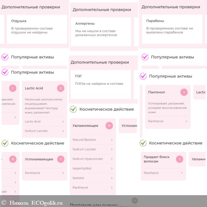 Состав замечательный. Он натуральный, безопасный. В нём отсутствуют: искусственные консерванты, красители, ароматизаторы, отдушки, парабены, минеральное масло, силиконы, агрессивные сульфаты.