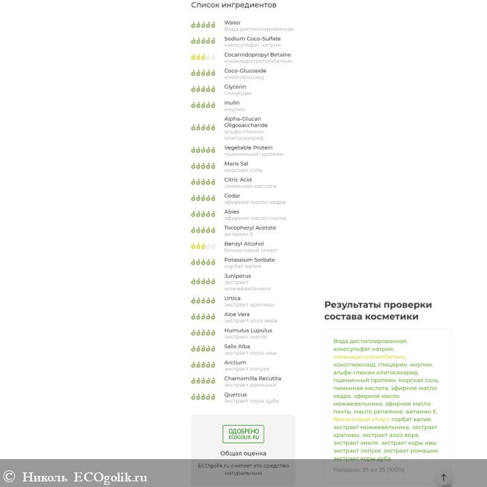 Аромат у шампуня приятный, натуральный, хвойный. Чувствуются нотки пихты, в шлейфе кедровые и можжевеловые ноты.