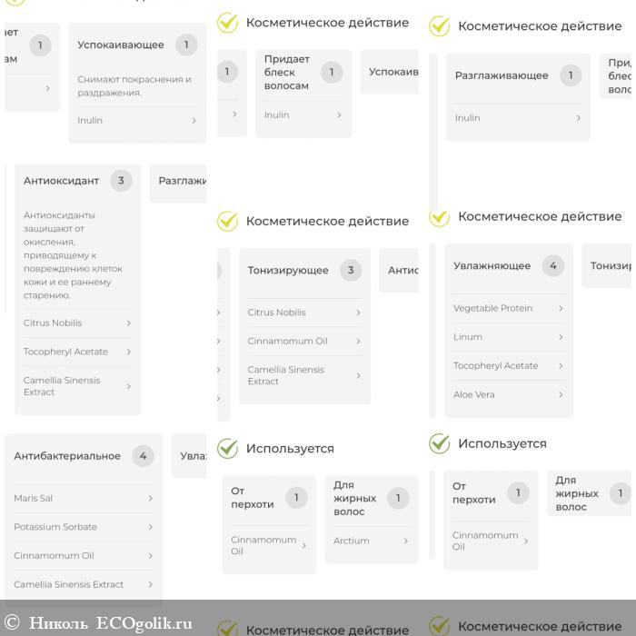 - Hippophae rhamnoides extract (экстракт облепихи) смягчает волосы, заживляет, питает, придаёт блеск, стимулирует их рост и восстанавливает блеск после окрашивания.