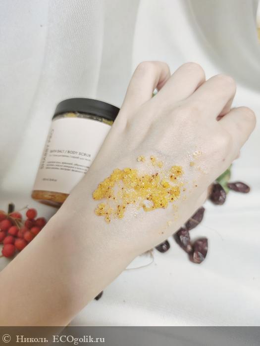 Аромат у соль/скраба цитрусовый. Достаточно насыщенный, яркий, приятный, поднимающий настроение, бодрящий и тонизирующий, не удушающий, не надоедающий, не резкий. После смывания уходового продукта аромат остаётся на коже в течение нескольких часов.