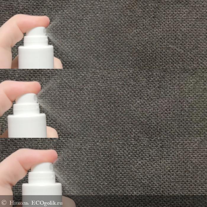 Распыление мелкодисперсное. Дозатор не бьёт струёй, не плюётся, из самого флакона спрей не вытекает. Угол распыления имеет достаточно широкий, охватывает большую область.