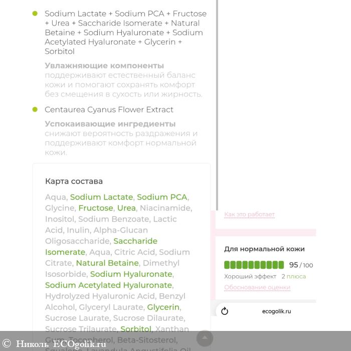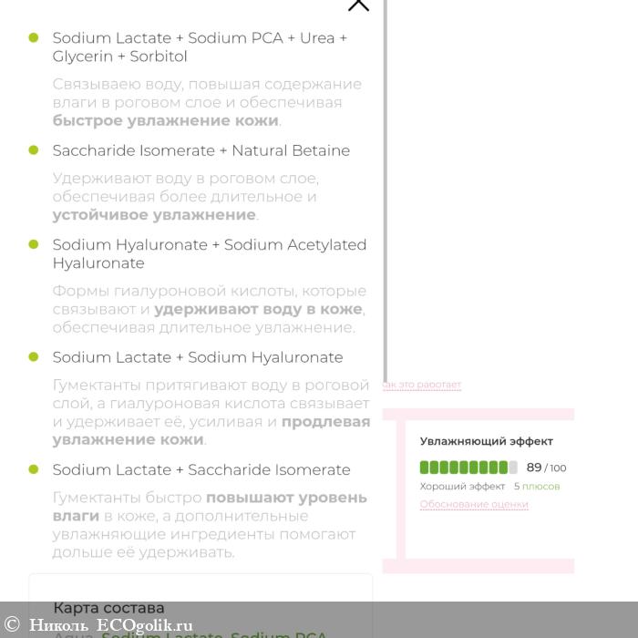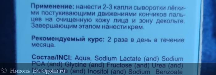 Сначала дано описание этой сыворотки, что она даёт, что в ней есть комплекс из 4-х видов гиалуроновой кислоты и НУФ (натуральный увлажняющий фактор).