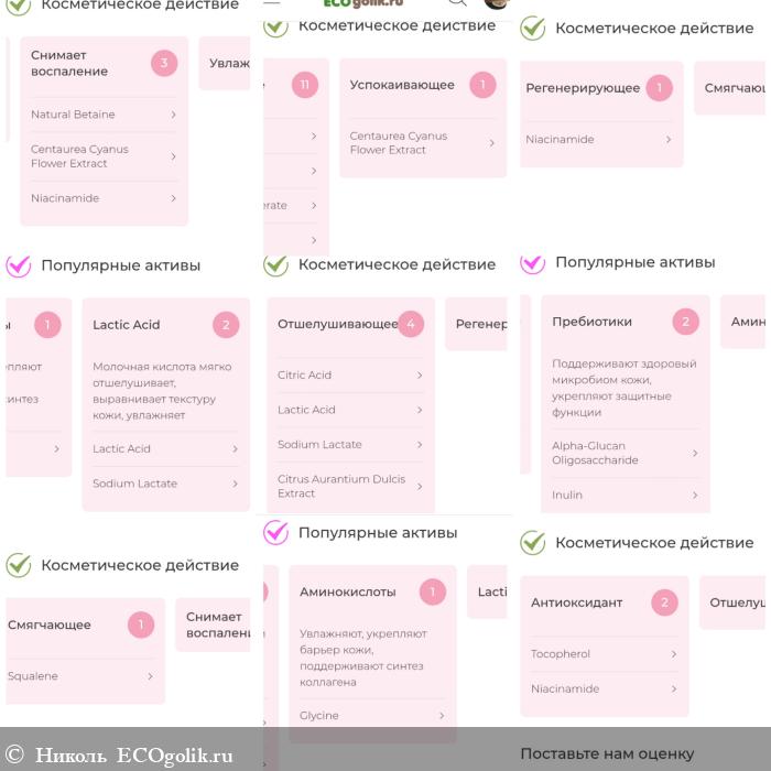 - Centaurea Cyanus Flower Extract (василька экстракт СО2) Снижает отечность, уменьшает мелкие морщины, регулирует секрецию кожных желез, способствует сужению пор. Обладает тонизирующим, регенерирующим и биостимулирующим действиями.