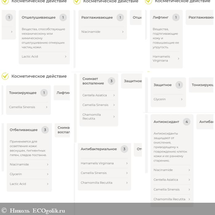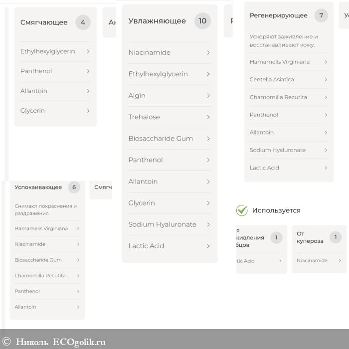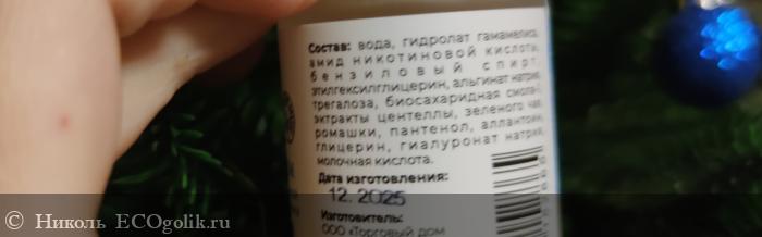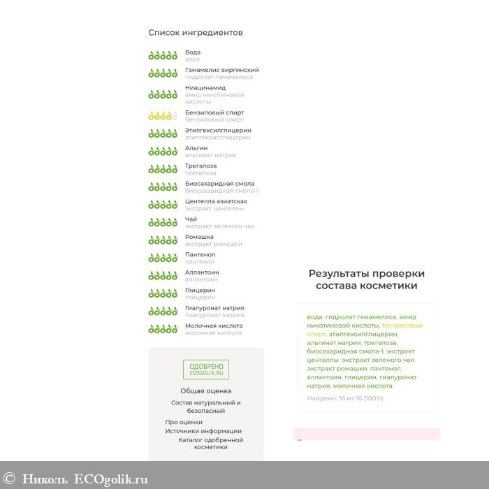 В составе: вода, гидролат гамамелиса, амид никотиновой кислоты, бензиловый спирт, этилгексилглицерин, альгинат натрия, трегалоза, биосахаридная смола-1, эктракты центеллы, зеленого чая, ромашки, пантенол, аллантоин, глицерин, гиалуронат натрия, молочная кислота.