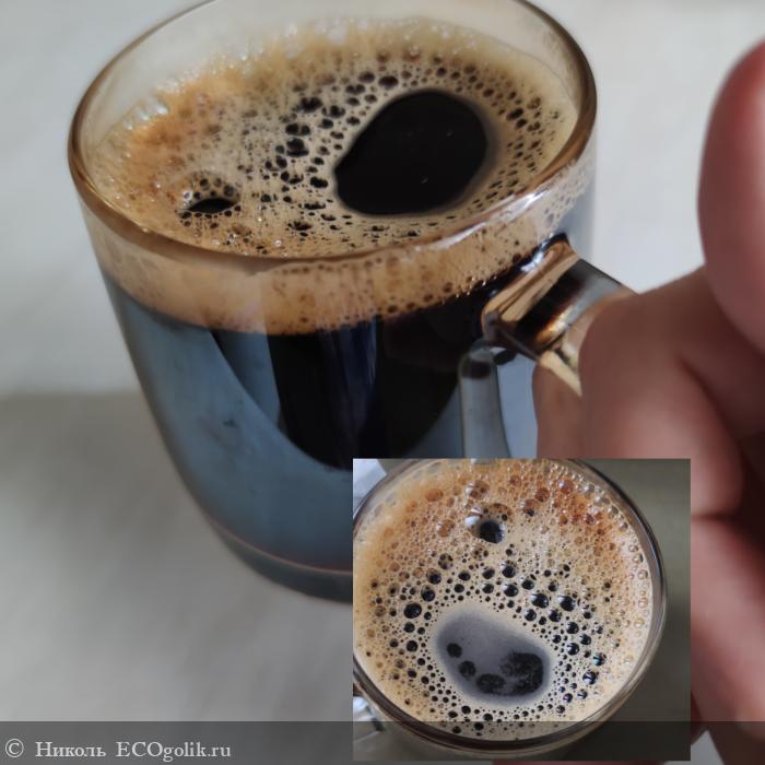 При заваривании сначала образуется такая пенка, как бывает у кофе. По цвету можно сказать, что он почти чёрный. Сам цикорий не горчит, чуть бодрит с утра. Растворяется без остатка в чашке.