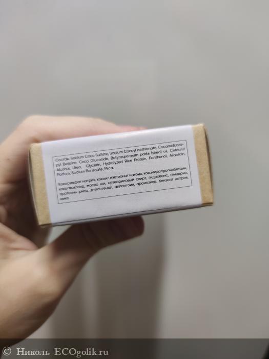 Твёрдый гель для душа я пробовала впервые. И для себя я сделала вывод, что это очень удобный формат. Упакован гель был в коробочку бежевого цвета, сделанную из картона. На саму коробку с двух сторон приклеены влагоустойчивые наклейки нежного сиреневого цвета.