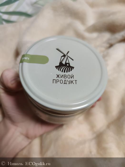 На крышке имеется логотип бренда - мельница и надпись живой продукт.