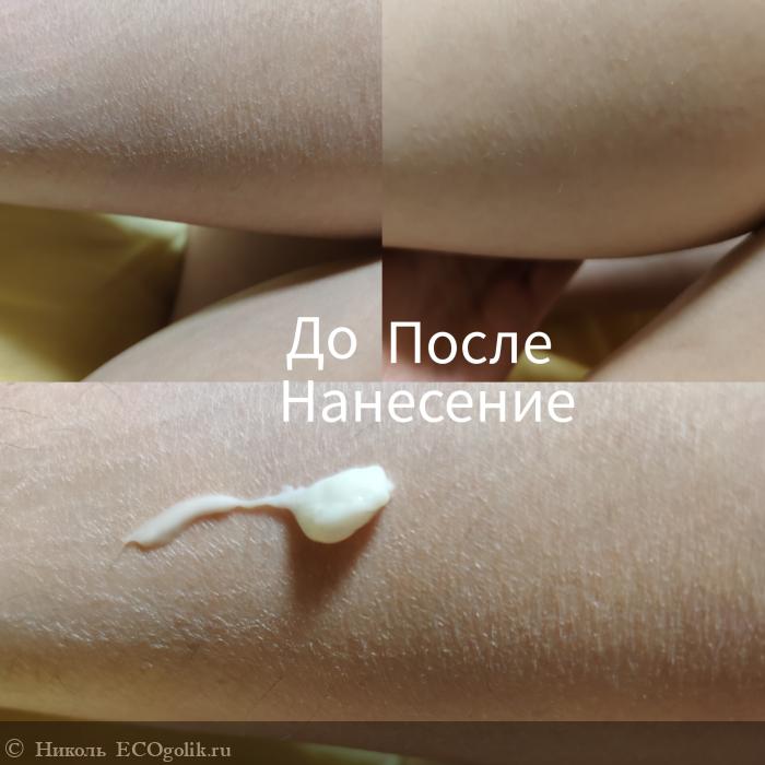 однородной текстуры белого цвета. Крем быстро проходит стадию белых полос, он не течёт от теплоты кожи тела, лица. (Раньше у меня после загара были кремы неудачные, которые я наносила на теплую кожу после загара и даже душа уже и они текли по ней, как молочко. С этим кремом такого нет.)