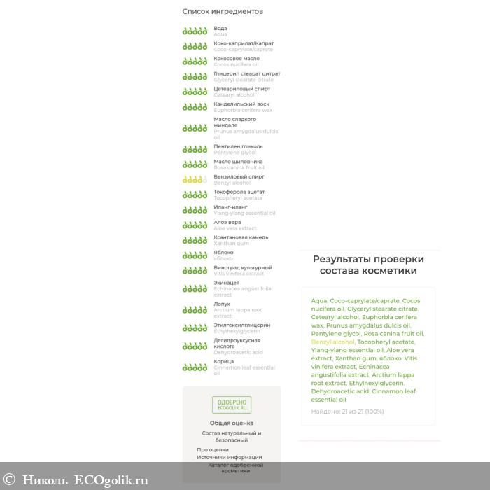 После указан шикарный состав. Он направлен на питание, увлажнение, регенерацию кожи и её смягчение, а так же защиту от неблагоприятных воздействий окружающей среды. В нём нет синтетических отдушек, искуственных красителей и консервантов, минерального масла, силиконов, химозных плёнкообразователей.