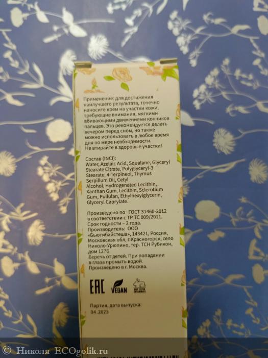 В составе крема азелаиновая кислота (она не только при прыщах, но и от розацеа хорошо помогает), чайное дерево и тимьян обеззараживающие, как я уже говорила, также экстракт цветков красного клевера, экстракт иван-чая узколистного.
