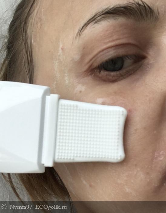 Я беру свой ультразвуковой прибор для ухода за лицом, надеваю силиконовую насадку и включаю режим «Брашинг», и таким образом вожу по массажным линиям и круговыми движениями 2-3 минуты