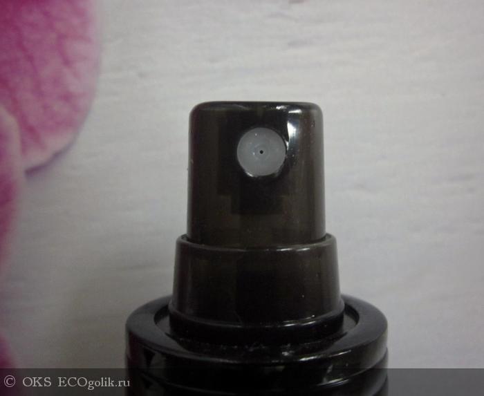 На дозаторе находится черный пластиковый колпачок слегка прозрачный через него можно увидеть сам дозатор. Дозатор-распылитель при нажатии выдает мелкодисперсное облако средства.Работает он исправно еще ни разу не подвел.