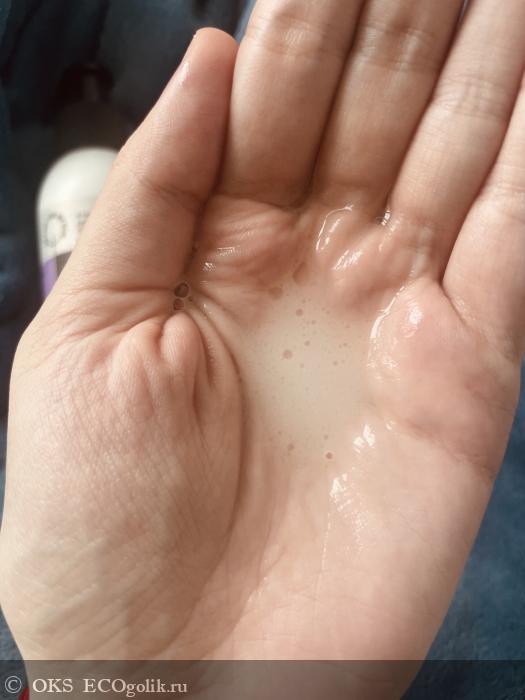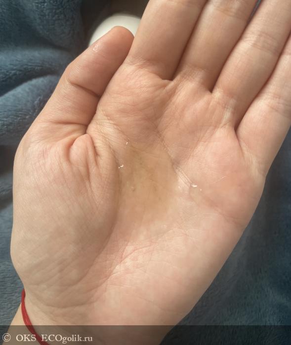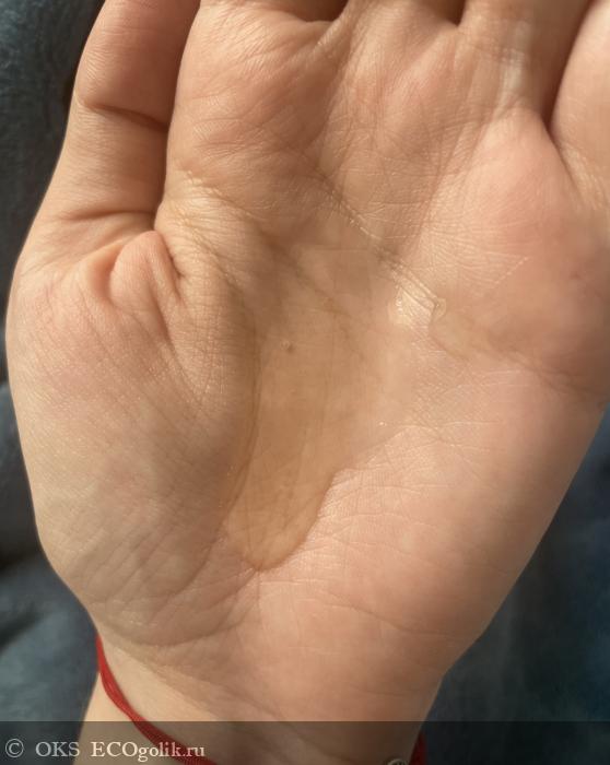 Масло жидкое, быстро стекает с рук. Жирненькое, как и свойственно маслу, но при этом легкая текстура. Оно прозрачное, но имеет слегка желтоватый оттенок.