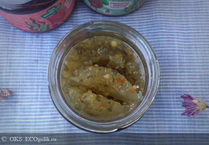 Раньше я очень любила мармелад, но тот который продается в наших продуктовых магазинах не совсем полезный. Потому мне очень любопытно было впервые попробовать мармелад в банке еще и с морской капустой, которую я тоже люблю, а такое сочетание интересно в двойне.