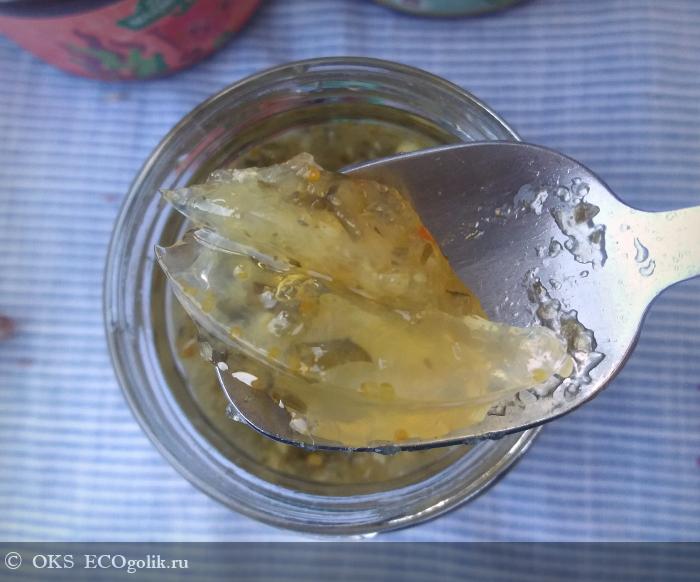 Вот здесь уже консистенция более желейная. Внутри баночки можно заметить кусочки апельсина и морской капусты. Этот мармелад тоже оказался очень вкусный, сладкий в нем нет никакой горечи или кислинки, во вкусе ярко ощущается сочный апельсин и слегка нотки капусты. Пожалуй в этом варианте капуста чувствуется меньше всего. Мне такое сочетание тоже очень понравилось.