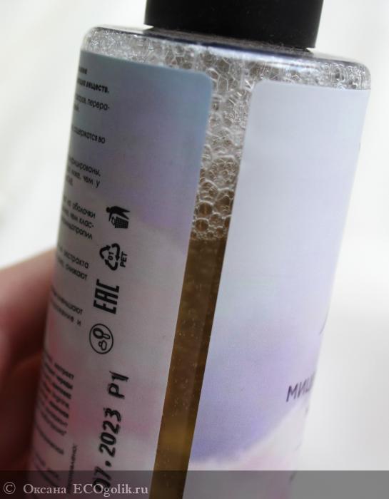 Мицеллярная вода жидкая, прозрачного цвета. При взбалтывании хорошо пенится.
