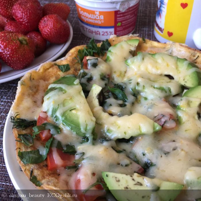 Для блинчика я беру 2 яйца и примерно 1 ст. ложку муки (в день нельзя употреблять больше 30 г). Чуть поджариваю, переворачиваю. И на одну сторону кладу начинку. Можно использовать все, что найдётся в холодильнике: сыр, курица, сёмга, помидоры, зелень, шампиньоны, авокадо и т.д. Можно делать и сладкие, если любите: бананы, арахисовая паста. Экспериментируйте