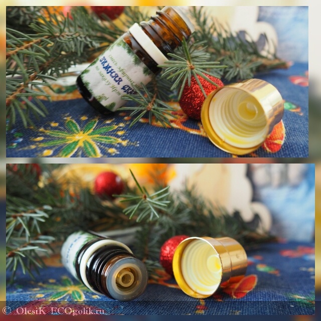 Пузырек, как мы видим, сделан из темного стекла, для того чтобы эфирное масло было защищено от солнечных лучей, и полезные свойства, находящихся в данной смеси, сохранились на весь период его использования. Закрывается он, белой крышечкой, а уже сверху на нее одевается колпачек золотого цвета, и это, конечно, изюменка этого пузырька.
