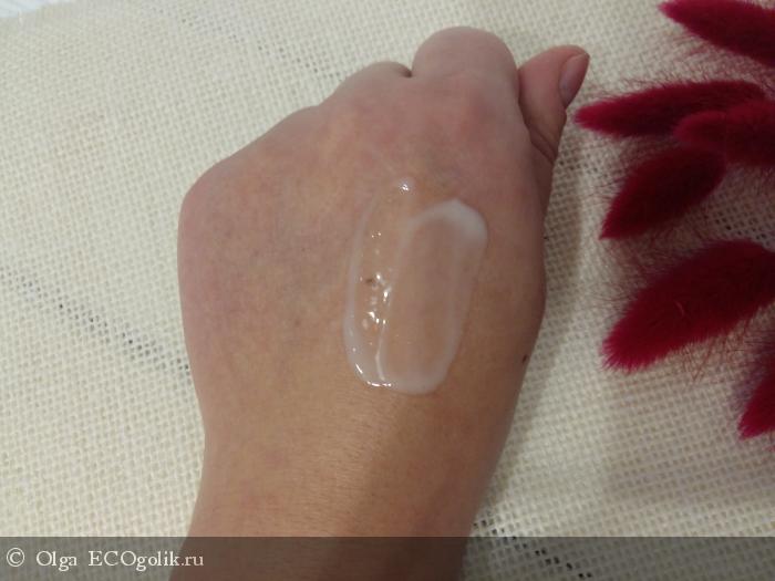 Консистенция гель-мусса густая, но в тоже время достаточно легкая, больше похожая на молочко, тактильно очень нежная, светло-персикового цвета с приятным, не раздражающим растительным ароматом.