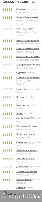 Deionized water with infusion of Amaranthus Caudatus (Love Lies Bleeding) Seed Extract (экстракт семян амаранта), Glycyrrhiza Glabra (Licorice) Extract ( экстракт солодки), Punica Granatum (Pomergranate) Seed Extract (экстракт семян граната), Rhodiola Rosea Root Extract (экстракт родиолы), Bambusa Vulgaris (Bamboo) Extract (экстракт бамбука), Prunus Persica (Peach Kernel) Oil (масло персиковых косточек), Glyceryl Monostearate, Cetearyl Glucoside, Sorbitol, Hydrolyzed Wheat Protein (гидролизованные протеины пшеницы), Glycine Soja (Soybean) Sterols, Hydrolyzed Keratin (гидролизованный кератин), Glyceryl Oleate, Betaine, Lactic Acid (молочная кислота), Phytosqualane, Linoleic Acid (and) Oleic Acid (and) Linolenic Acid (витамин F), Tocopherol(витамин E), D-panthenol (провитамин В5), Ethylhexylglycerin, Sodium Benzoate, Parfum.