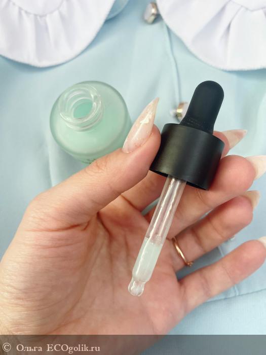 Крышка здесь откручивающаяся со встроенной пипеткой. Удивительно, но для бюджетного средства пипетка очень качественная. Она даже лучше, чем у многих дорогих брендов. Ей удобно набирать сыворотку и переносить ее на лицо. Средство из пипетки не вытекает, плотно держится. На все лицо хватает буквально 3 капли, поэтому расход минимальный.