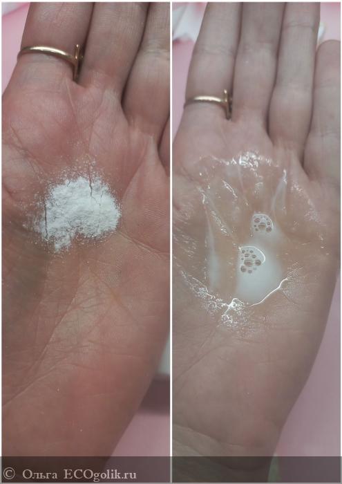 Я использую энзимную пудру преимущественно вечером, несколько раз в неделю. Средство очень удобное и простое в применении. Я наношу на ладонь небольшое количество энзимной пудры, добавляю воды и вспениваю. В итоге получается что-то похожее на эмульсию. После умывания я просто смываю остатки энзимной пудры обычной водой.