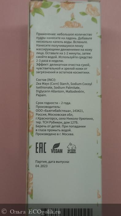Несомненным достоинством энзимной пудры Beauty by Stesha является то, что в составе средства нет парабенов, силиконов, сульфатов и других компонентов с сомнительной репутацией. Косметика бренда не тестируется на животных.