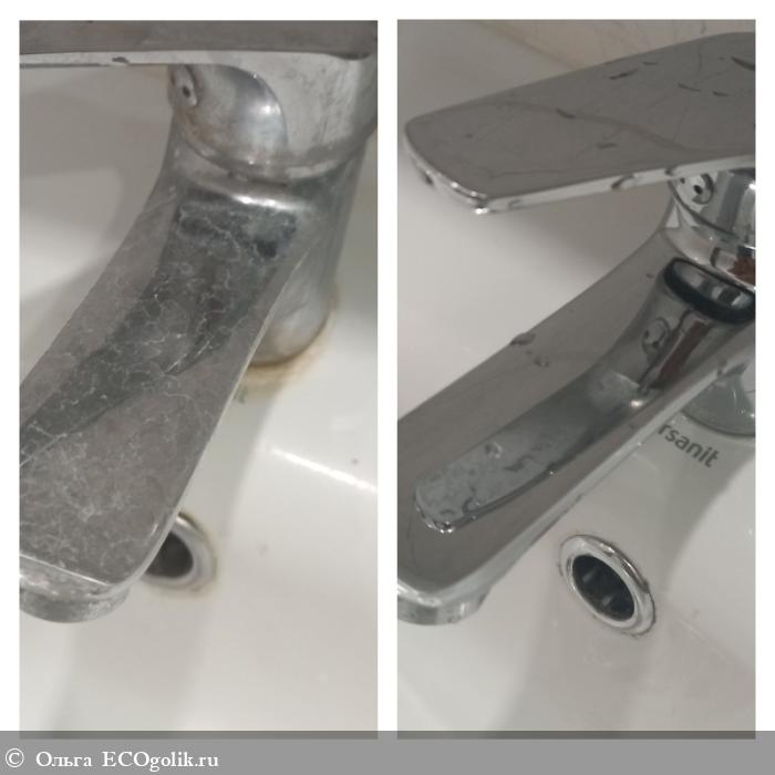 Как я упоминала в начале, известковый налет у меня образуется буквально мгновенно из-за жесткой воды. Гель отлично справляется с поставленной задачей, очень легко и качественно удаляет налет и ржавчину. После использования геля на смесителях не остается разводов, царапин. Все буквально блестит.