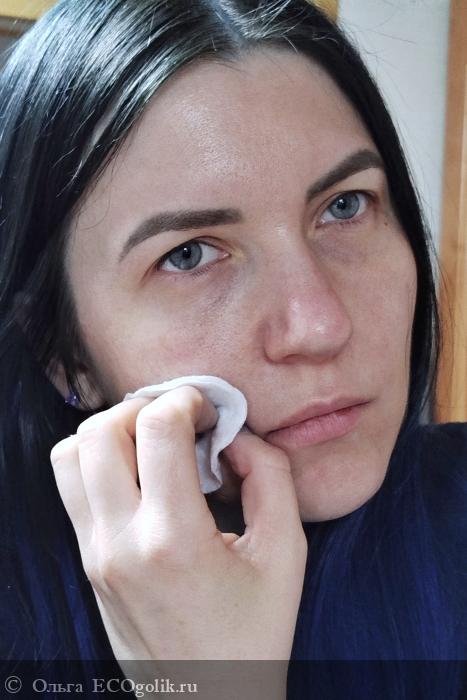 Я сначала пшыкаю жидкость на ватный диск, а затем протираю им лицо.