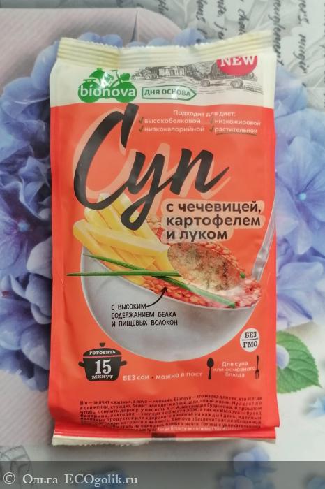 Привет всем! Сегодня я хочу рассказать о Смеси "С чечивицей, картофелем и луком" от бренда Bionova. Продукт находится в ярко-оранжевой плёночной упаковке с приятным оформлением.