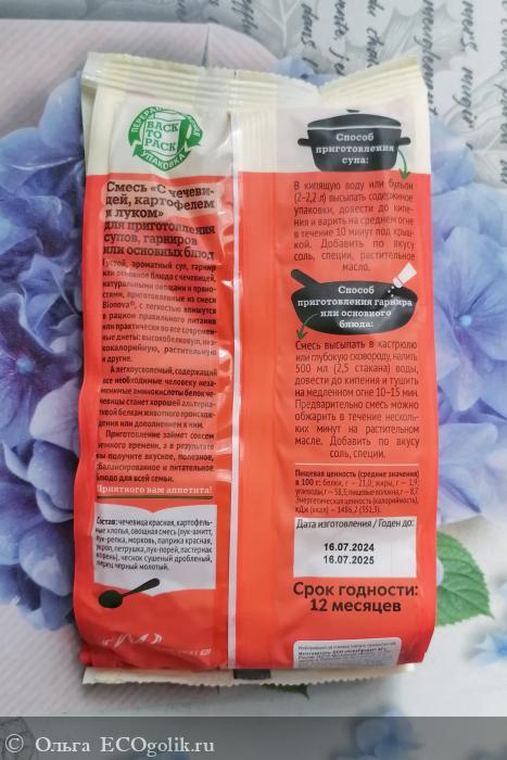 На обратной стороне пачки находится текст с информацией о полезных свойствах смеси, двух способах приготовления блюда, пищевой ценности и сроке годности.