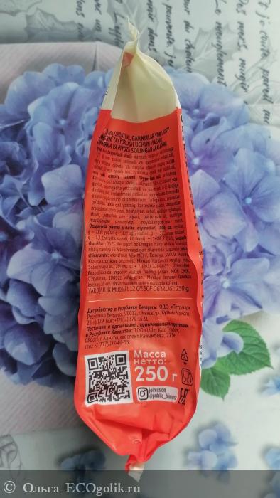 Сбоку на упаковке находится информация на казахском языке, а также условия хранения продукта и контактные данные производителя на русском языке.