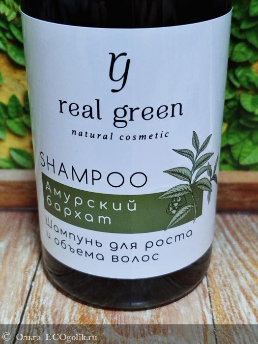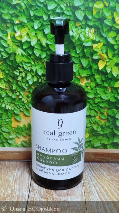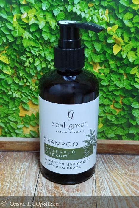 Сегодня я хочу рассказать о шампуне для роста и объёма волос "Амурский бархат" от бренда REAL GREEN. Уходовый продукт находится в бутылочке, изготовленной из тёмно-коричневого пластика.
