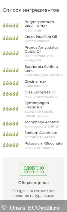 В списке ингредиентов присутствует несколько видов масел, воск и витамин Е (альфа-токоферола ацетат).